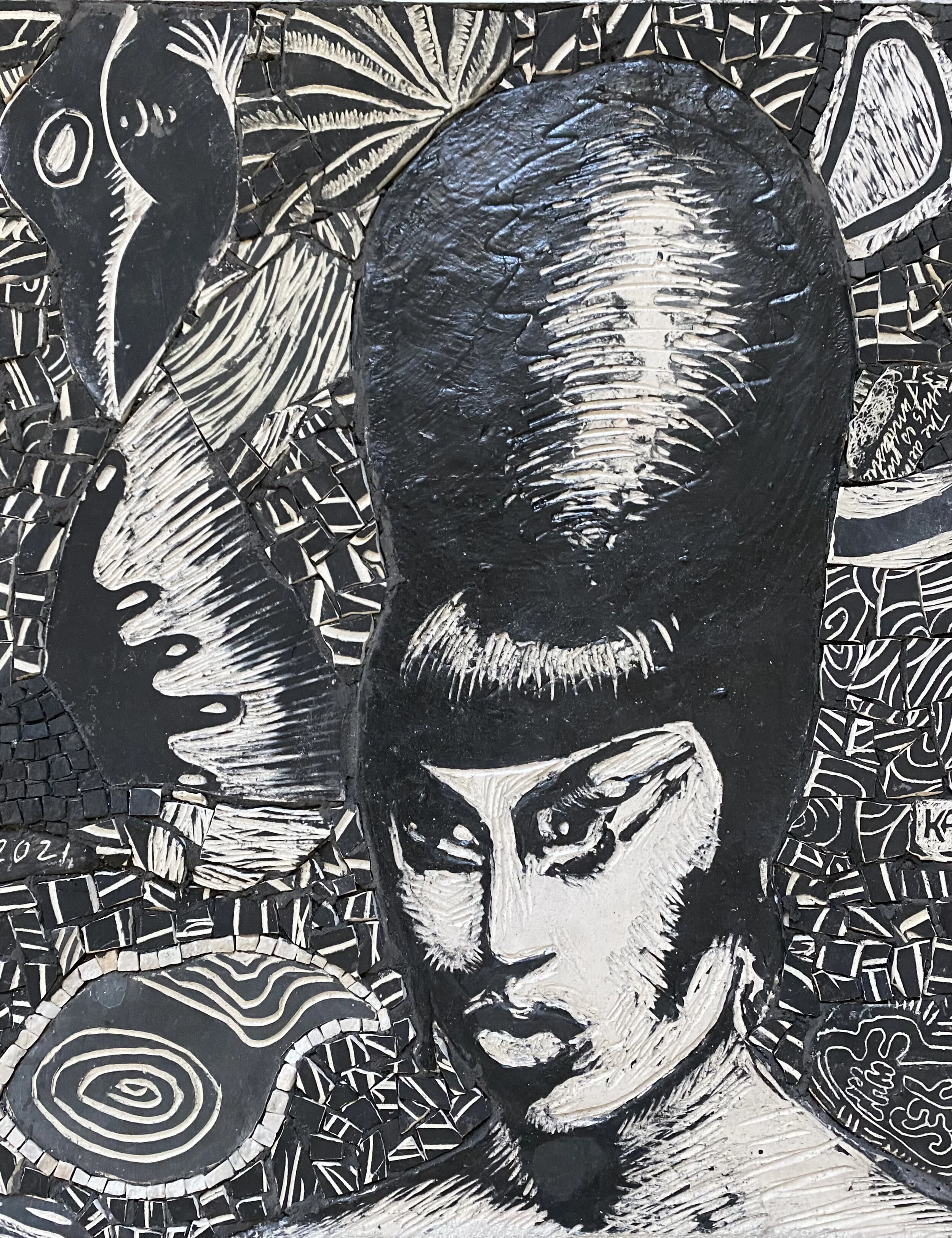 This month I created a piece for a group exhibition that is paying tribute to a local trans icon, Shea Coulee. We were asked to do portraits of them using a plethora of photographic images on their social media pages. I selected a dramatic black and white portrait of Shea. I decided to experiment with my usual process and imagery and create something more graphic and literal. I wanted to create them as recognizable yet imagined. After creating the portrait itself by drawing into a clay slab, I used DeBords theory of the dérive to compose the rest of the work. I let my instincts guide me, rather than plan or drawing as a structure ( although the portrait itself is the structure).