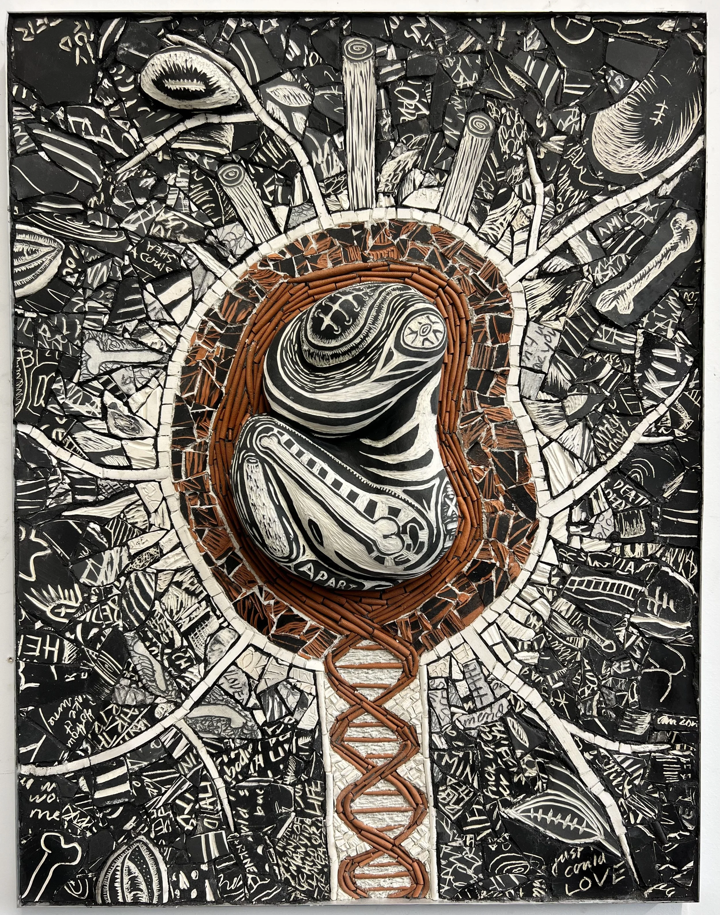 The work is one of the first explorations into a mosaic practice, and when I say MOSAIC PRACTICE I now mean a mosaic of disciplines as practice. Made in ceramic- the center solitary figure withdrawn and contained, isolated by a protective embryonic-like sac and surrounded by dead colored pink flesh shards of broken ceramic placed in the background. I never showed this piece. I shoved it behind some boards in my studio where is gathered some dust and few spider webs and enjoyed the darkness.