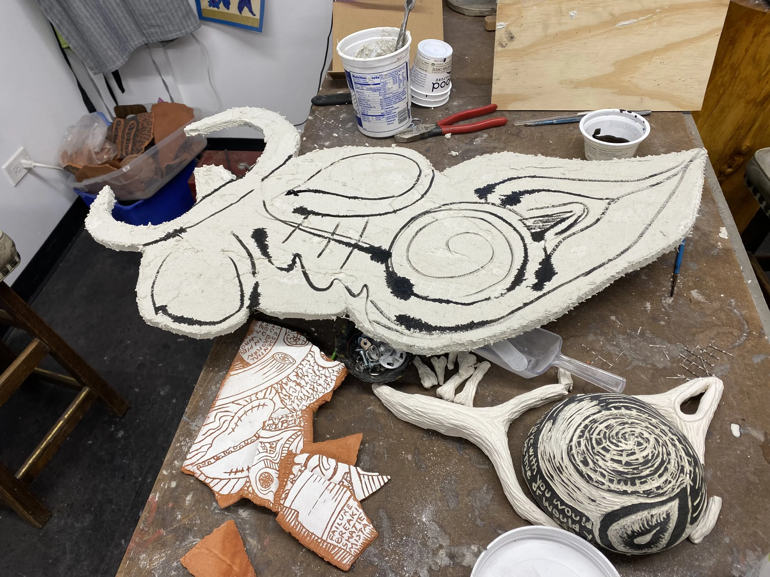 Process documentation. From drawing to form to sculpture to carving to firing to positioning to mortaring to composing. This piece based on drawings for the matriarch seeds - musings on fertility, infertility, loss and longing. I never think to document my process because I am so in it. This is uncomfortable to post these because I see it and hear it in my head - the potential and the whole song, and it is hidden, I get to expose it.