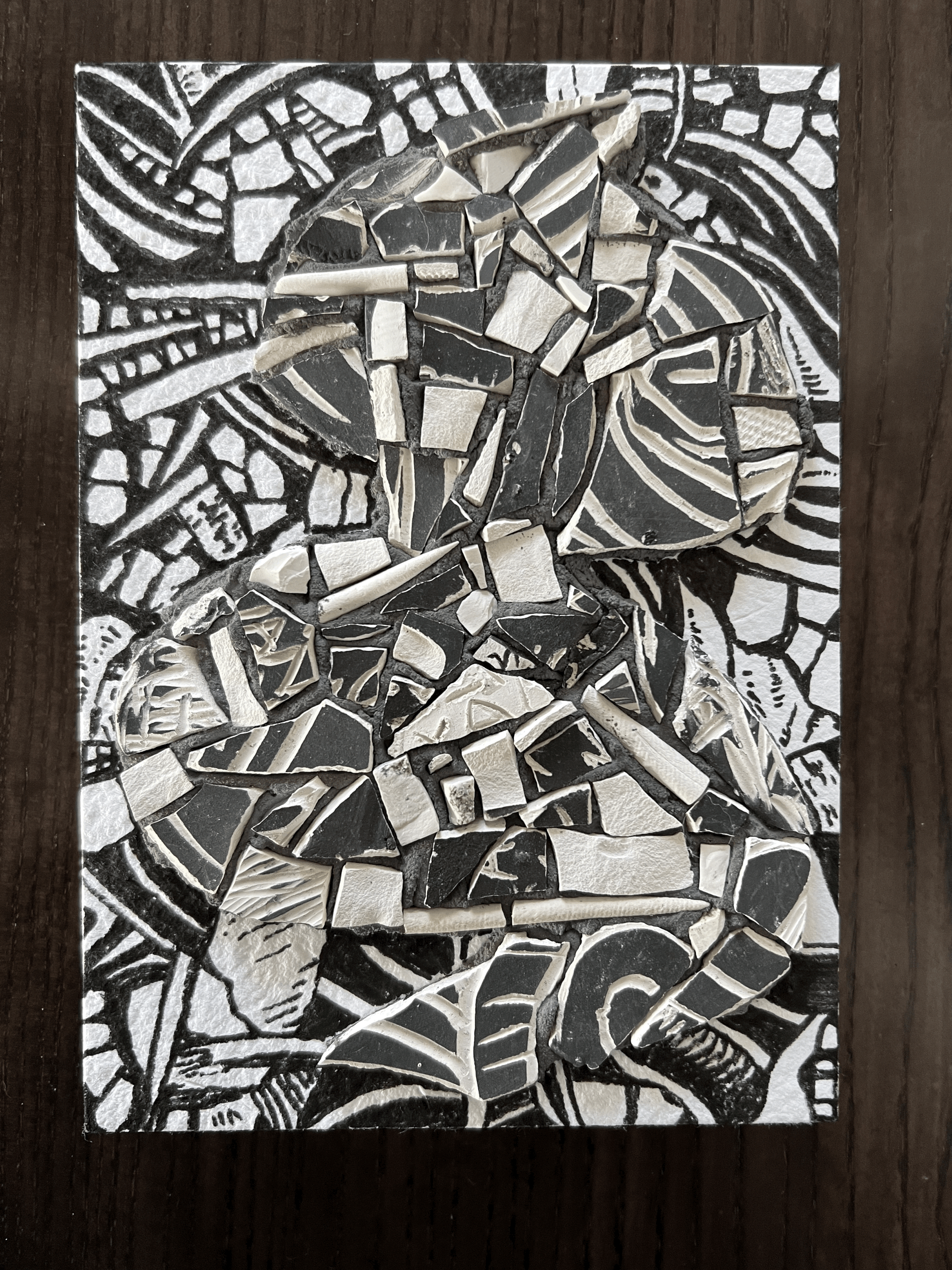 Experimenting with drawing and mosaic together. Mounted paper, set fragments, black ink.