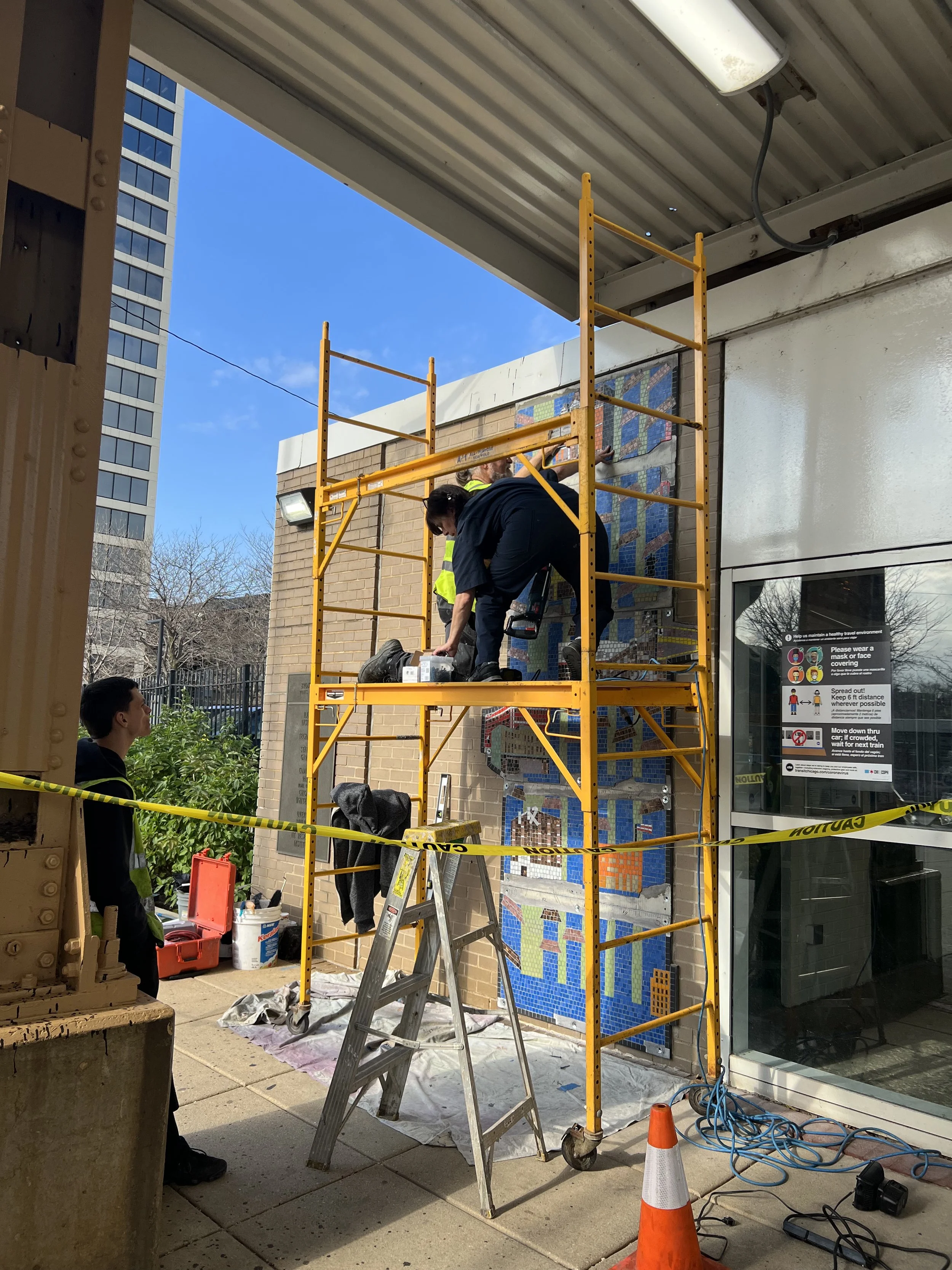 Installing the restoration and repair of a CTA mosaic at Bronzeville and 35th street. We removed the entire mosaic which was originally instally in the early 1990s and was missing large sections and “tiles”. The reconstruction took several months to complete but facilitating agreements and contracts with the Chicago Transit Authority took 2 years:)