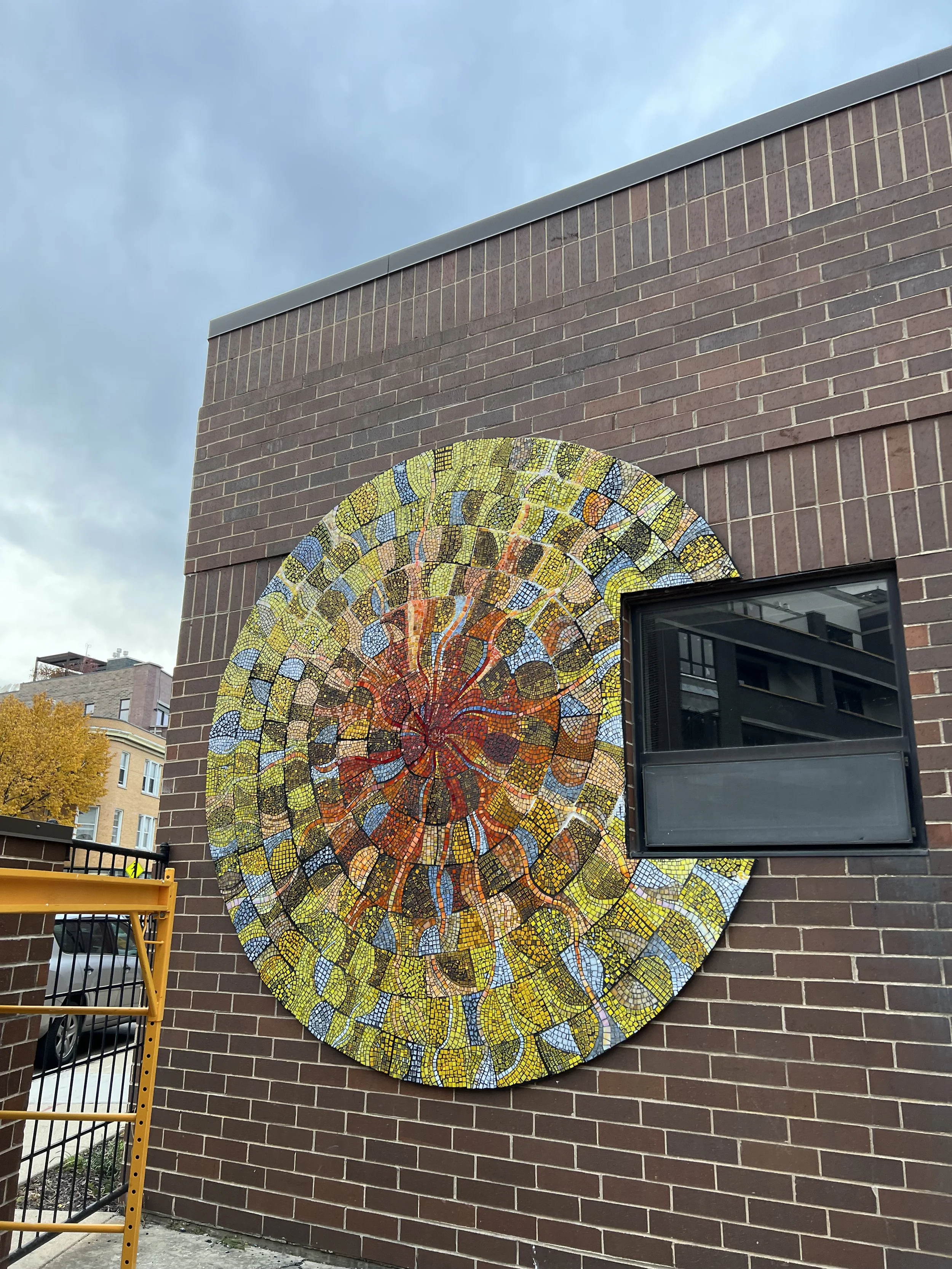 The “sun” was to honor their late Executive Director, Sheri, who died from breast cancer in 2018. We ( The Chicago Mosaic School team) design this so the participants would be able to individually contribute without compromising the design. There 120 participant that made 1/3 of the panels.