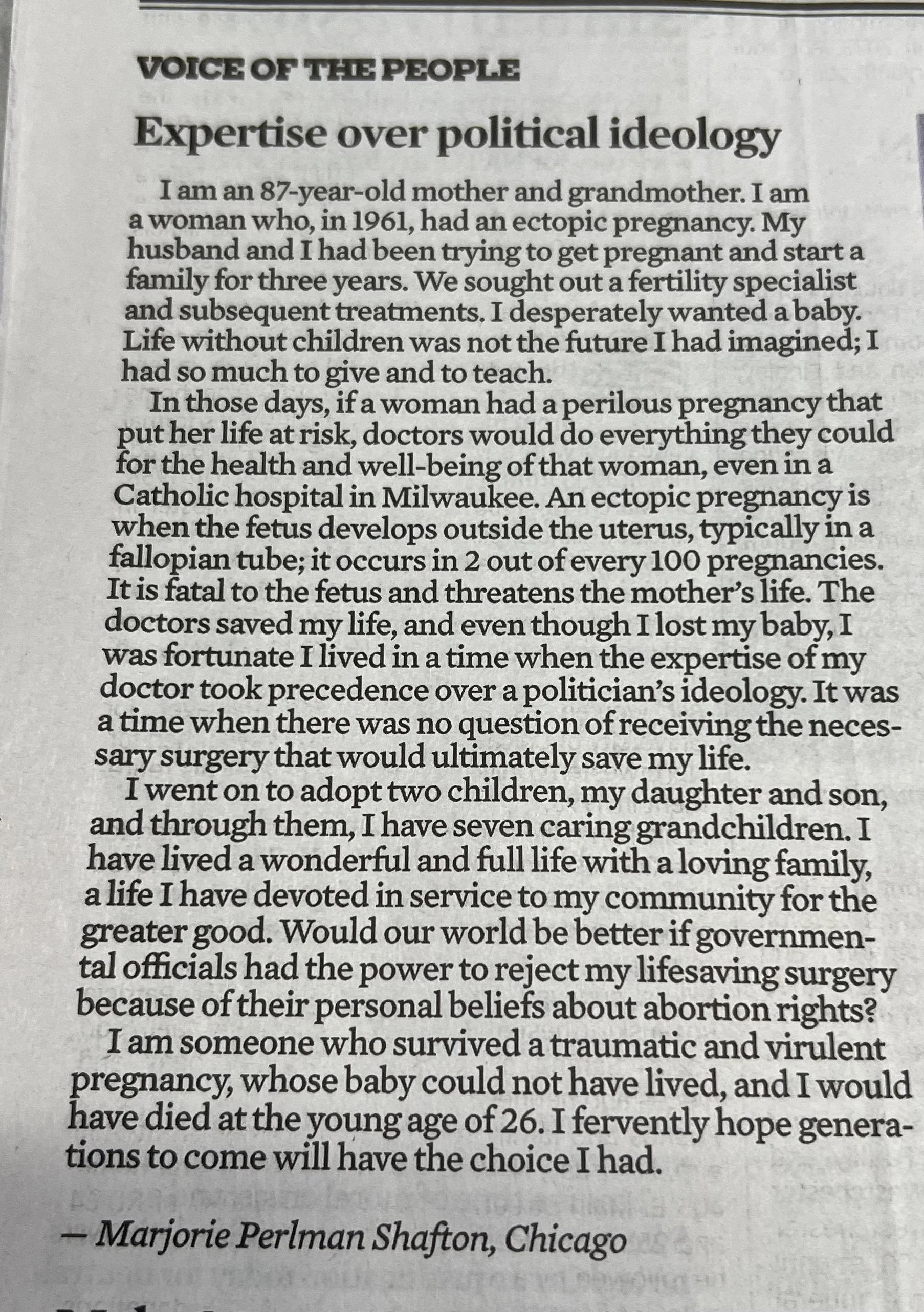 I could not be more proud of my mom. She and I have been through a lot together and have had a tumultuous relationship over the years. After it all, she is my best friend and she is my badass hero. So I helped her write this op-ed about her ectopic pregnancy and the politics about woman’s choice and health care. It was published on November 15th in the Chicago Tribune and it will be in Sunday’s New York Times ( November 20th). Amazing.