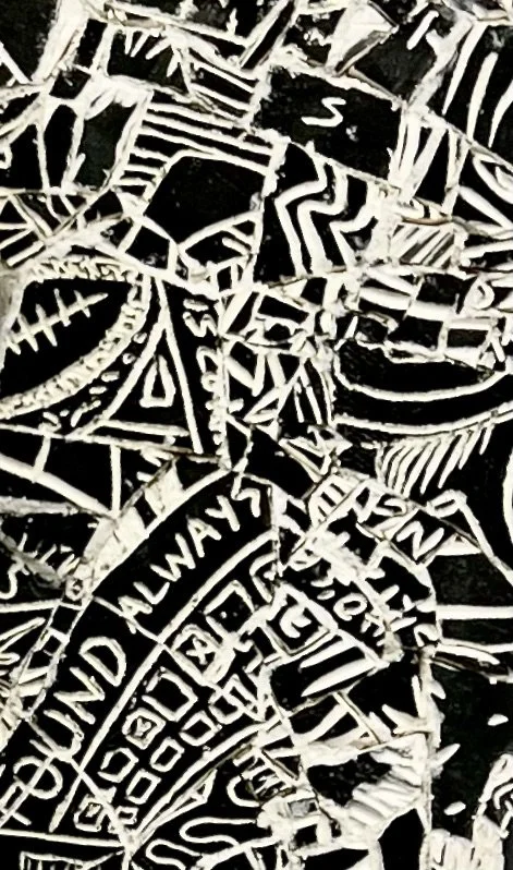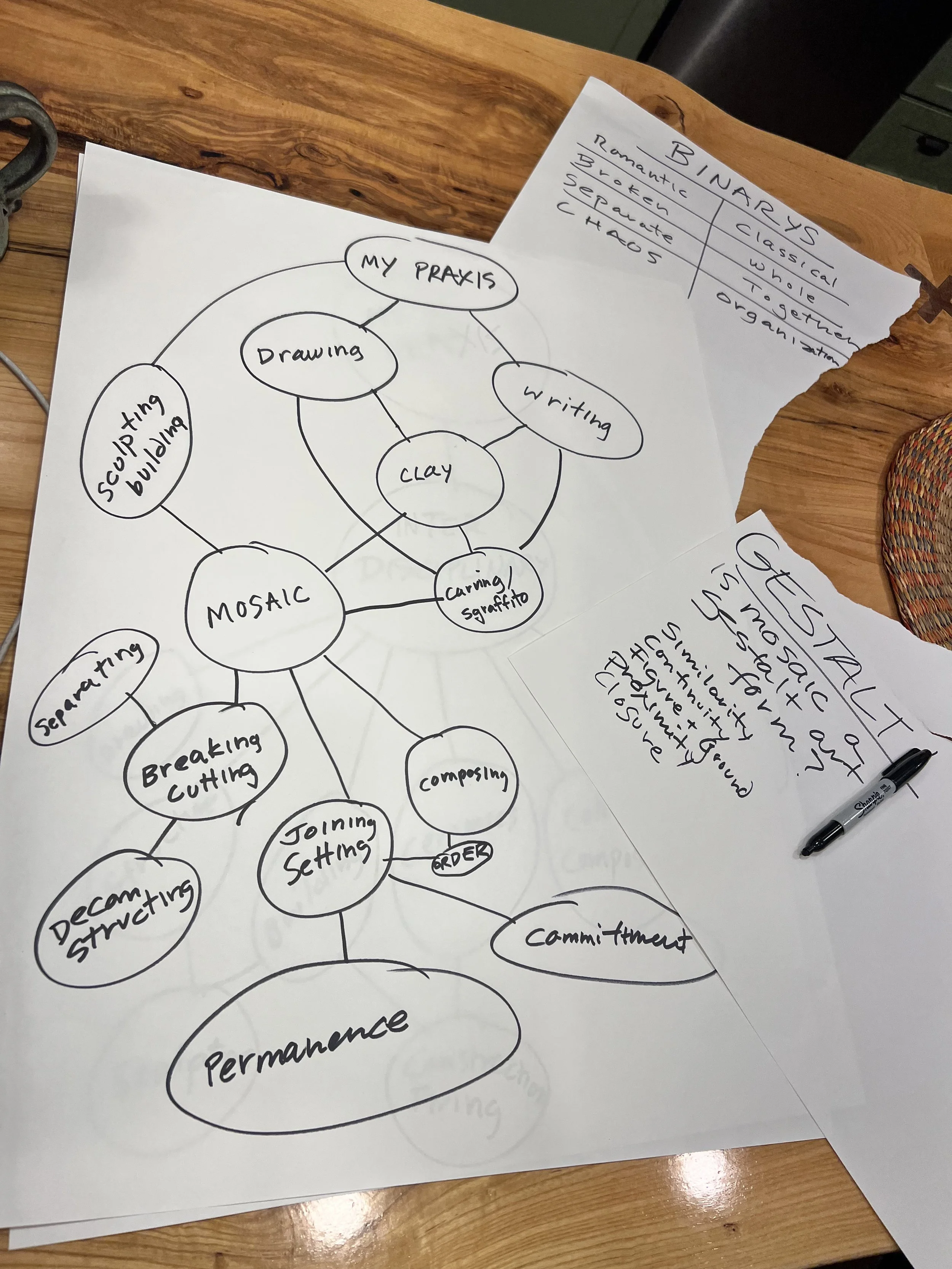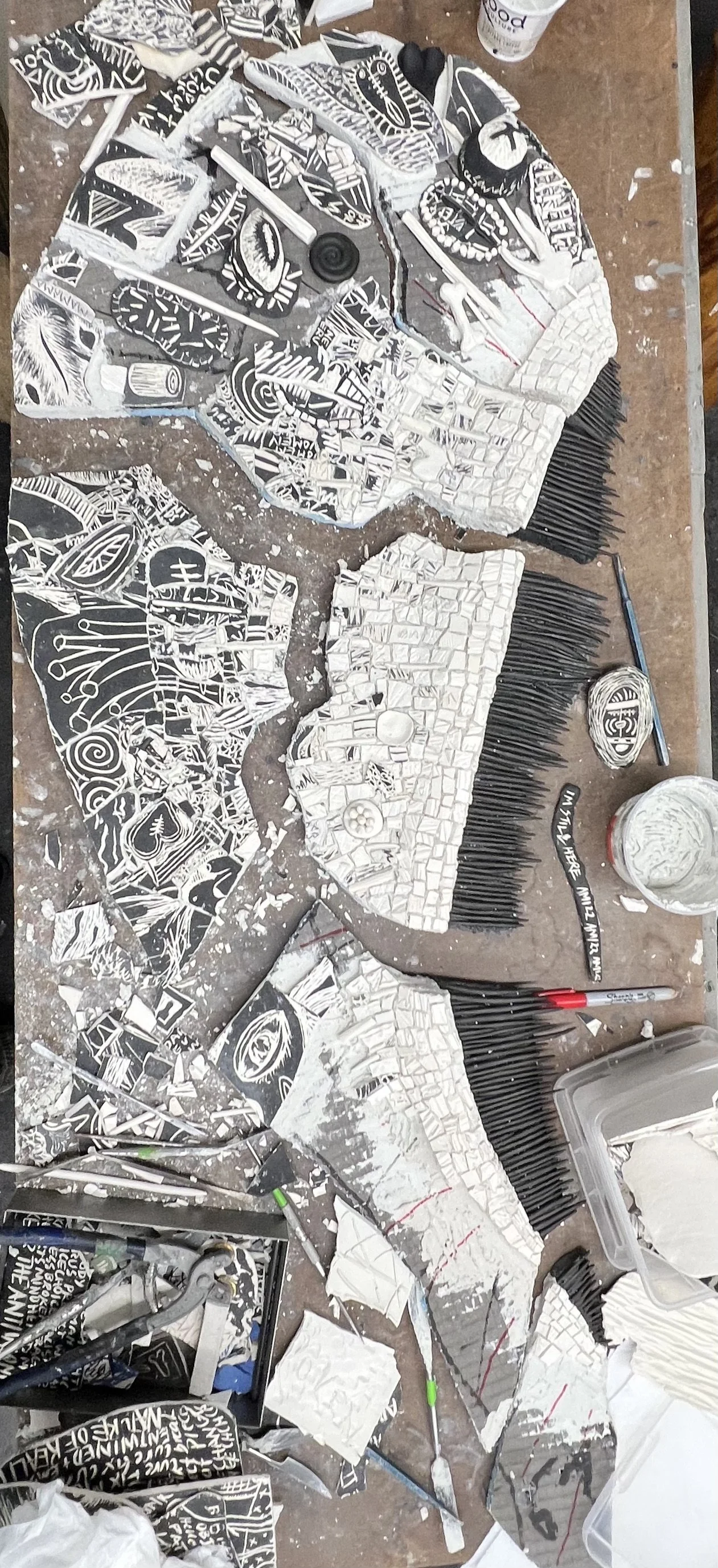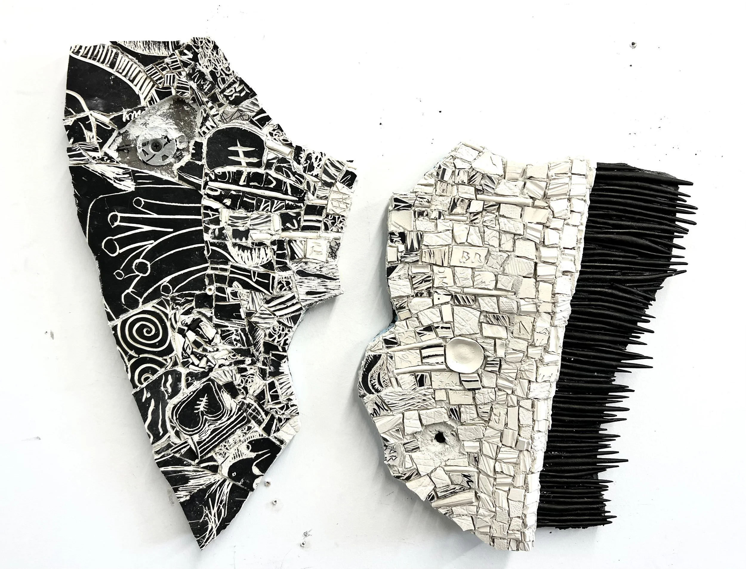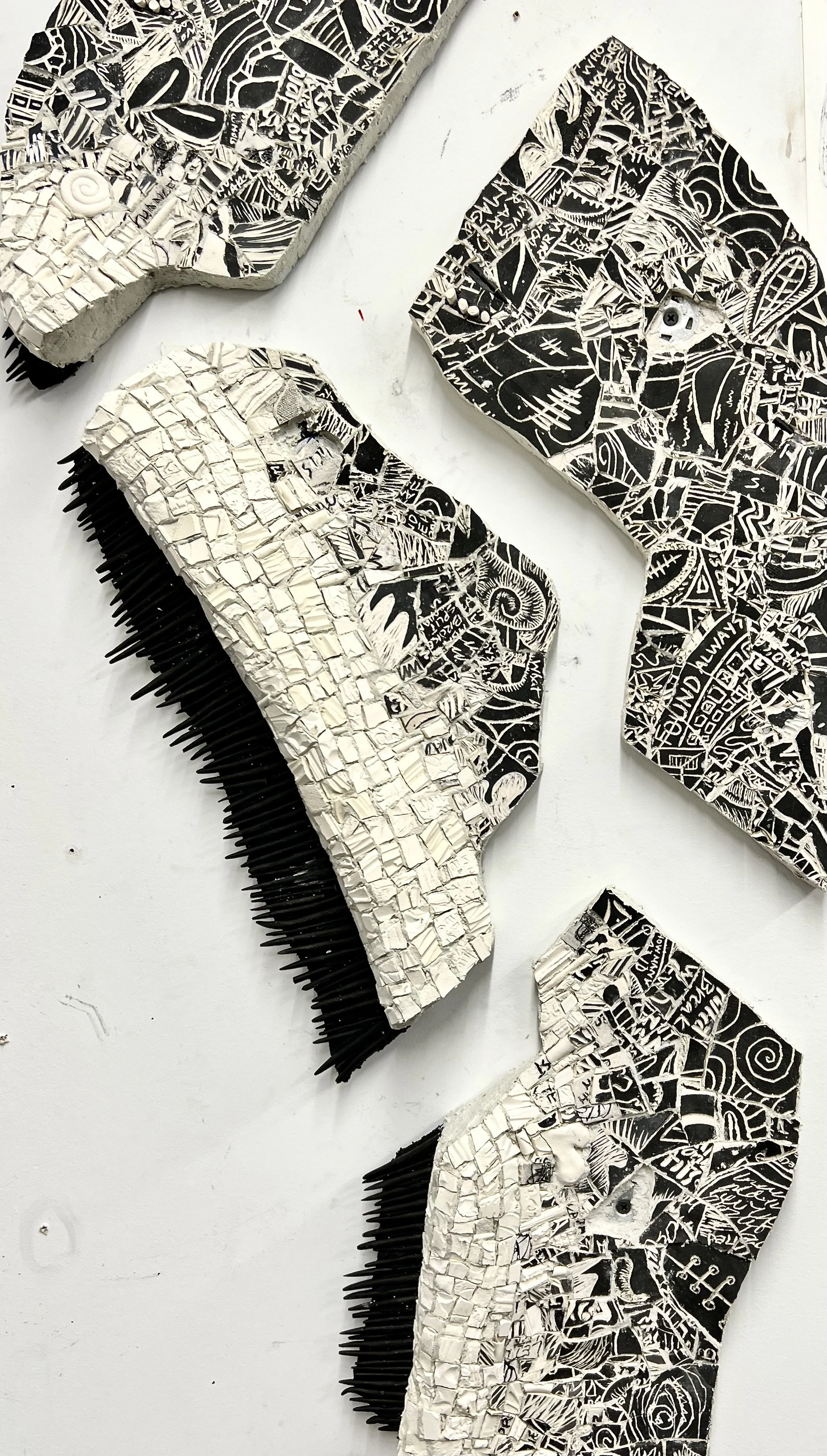 This piece represents a new way of working and solving new technical issues ( hanging systems, fragmentation of sections). I have been wanting the work to breath, to open, to break apart on a different realm. I wanted to combine drawing with the mosaic/sculpture/fragments to connect the pieces, considering drawing direct on the wall. I am pleased about the embedded information on the inscribed clay/ceramic- writings. poems, drawings that have been broken and reconstructed. It has the same quality as my notes and drawings, reflecting a phenomenology of organized chaos. Because the work is modular it can be reset and recomposed. I have yet to complete the center panel. Tentatively titled Severences.
