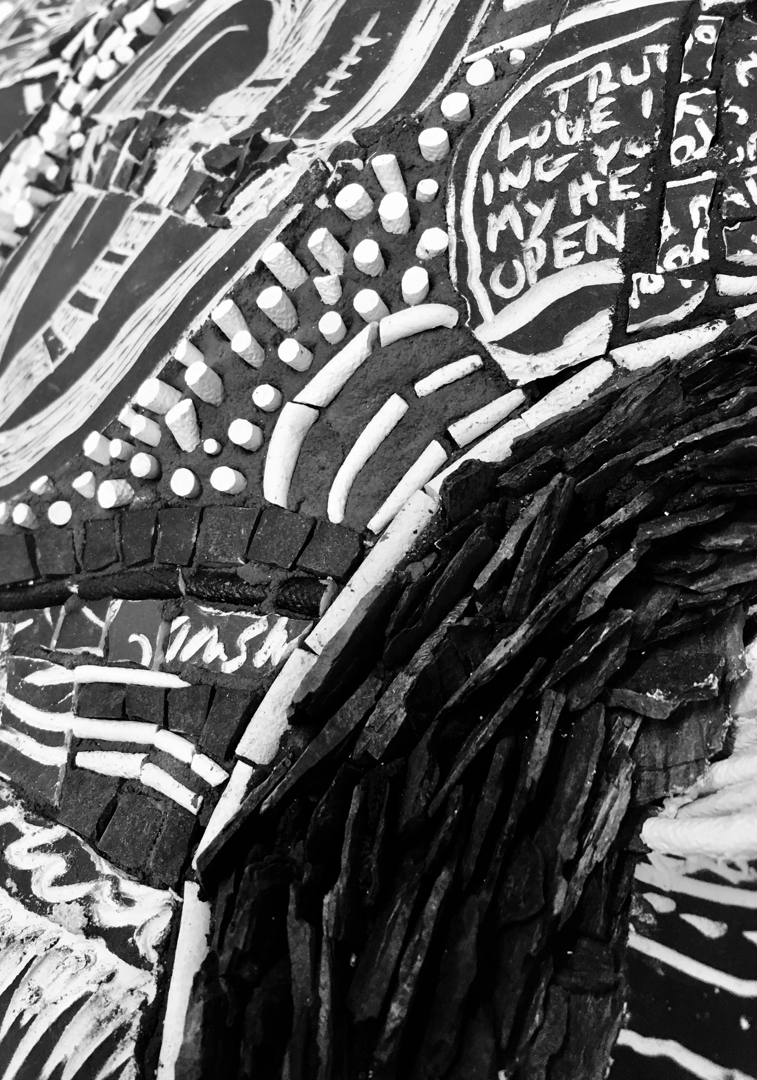 How do I understand mosaics...it is an art form and it is a metaphor. Both definitions inform each other. What is the force, the drive, the impetus that brings all these fragments and parts and pieces and scraps together? I don’t want to become a psychologist about this I want to understand the PROCESS of this specific artmaking. I need to CITE the “authorities” on mosaics-ok...makers vs observers? Both?That urge that we, as makers have albeit mosaic, collage, assemblage, bricolage (lots of ‘lages)....to put things together from possibly disassociated fragments or objects and make new- why??? The spaces inbetween THE INTERSTICES the lack of space breathing room mosaic not a skin surface it has shadow and light reflection opacity